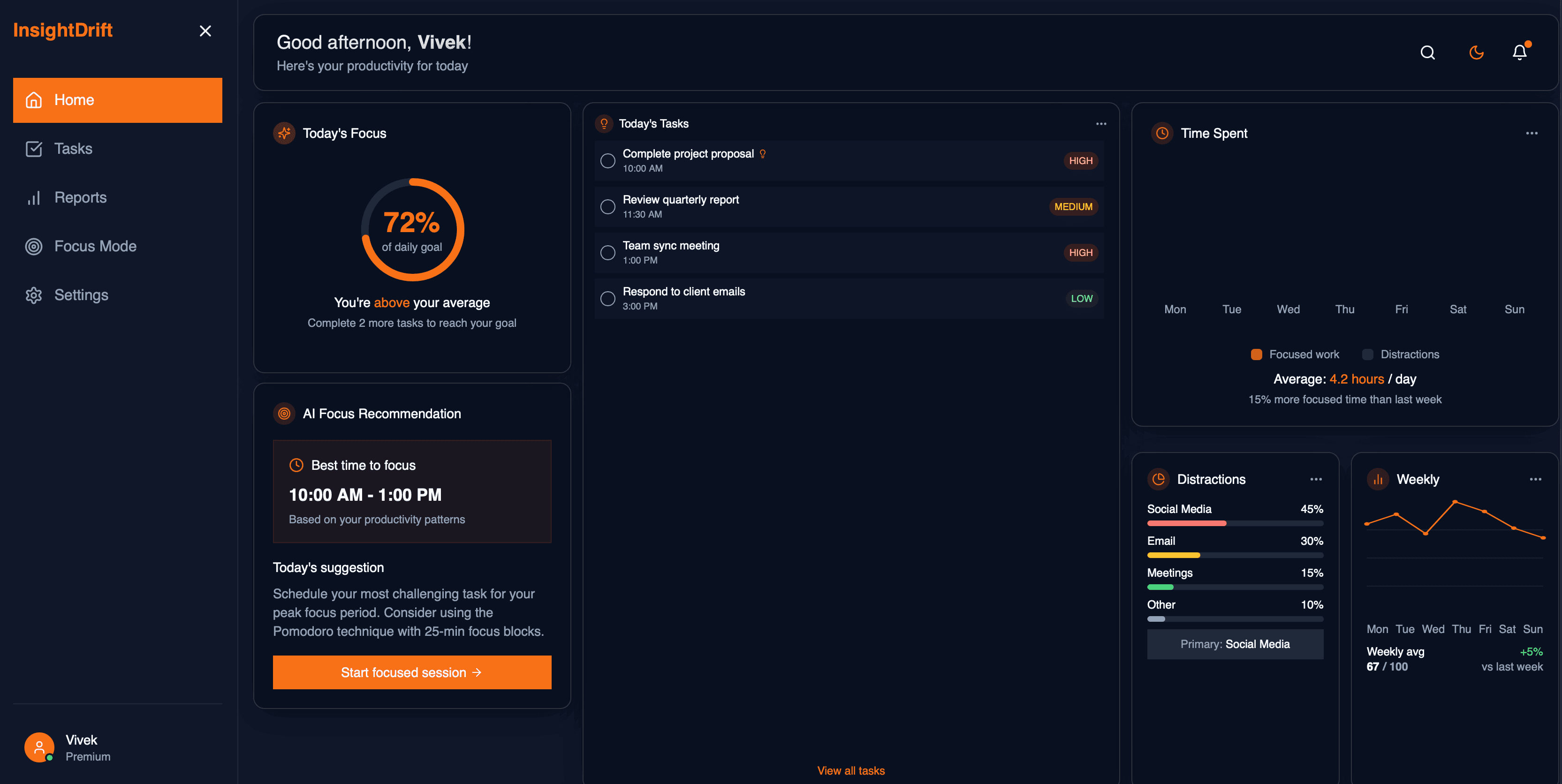InsightDrift analyzes your focus patterns and provides real-time AI-driven recommendations to help you work smarter.